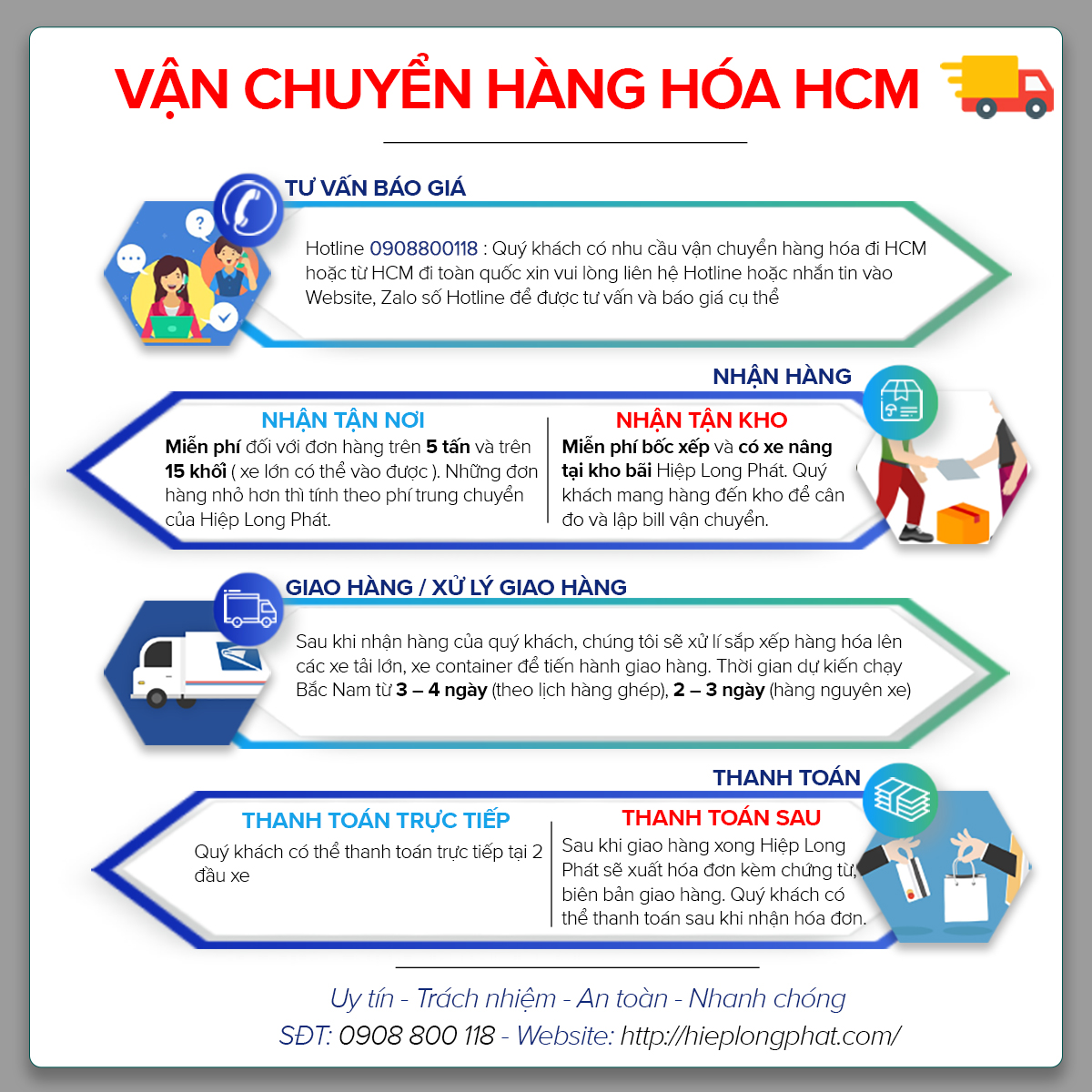 Là công ty dịch vụ vận tải nên HIỆP LONG PHÁT không ngừng cải thiện chất lượng dịch vụ nhằm mục đích đem đến sự hài lòng nhất đến với khách hàng của mình để nâng cao độ uy tín chuyên nghiệp